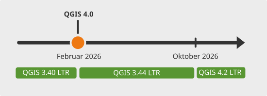 Die Veröffentlichung von QGIS 4.0 ist für Februar 2026 angesetzt und wird keine LTR-Version sein. Das aktuelle QGIS 3.40 LTR wird bis Mai 2026 mit Updates versorgt und erst dann durch QGIS 4.2 LTR abgelöst werden. Wenn Sie sich in Ihrer Organisation immer an der aktuellen LTR-Version orientieren wollen, haben Sie also noch ein gutes Jahr Zeit, sich um den Umstieg zu kümmern.