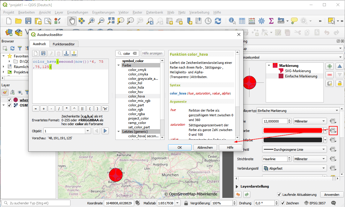 Dann erstellen wir uns noch ein zweites Symbol, bei dem wir die Farbe über die Zeit steuern. Dazu klicken wir auf das Plus-Zeichen neben den Symbolen und wählen ein einfachen Kreis, setzen ihn in den Hintergrund, erhöhen den Radius auf 12 und steuern die Farbe über einen Ausdruck. Dazu klicken wir auf das Kästchen für Datendefinierte Übersteuerung->Bearbeiten und verwenden folgenden Ausdruck: color_hsva(second(now())*6, 75,75,125)