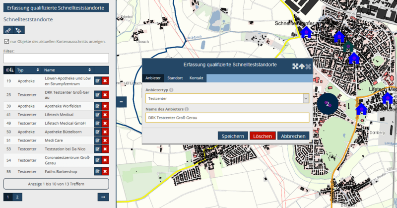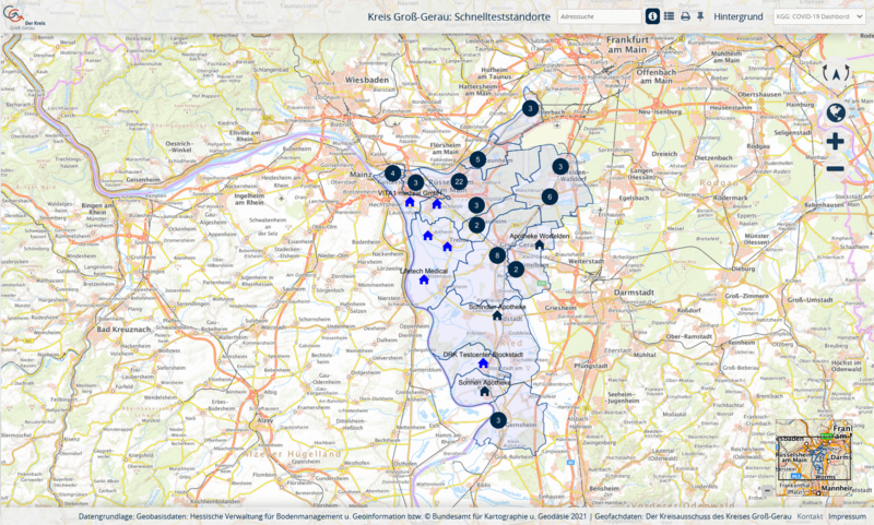 Die übersichtliche Kartenanwendung Kreis Groß-Gerau Schnnellteststandorte (geoportal.kreisgg.de/application/TK_KGG_Schnellteststandorte) gibt Auskunft zu Standorten, Kontaktmöglichkeiten und Öffnungszeiten der einzelnen Testzentren. Erfasst werden die Schnellteststandorte in einem einfachen Formular über den Mapbender-Digitizer.