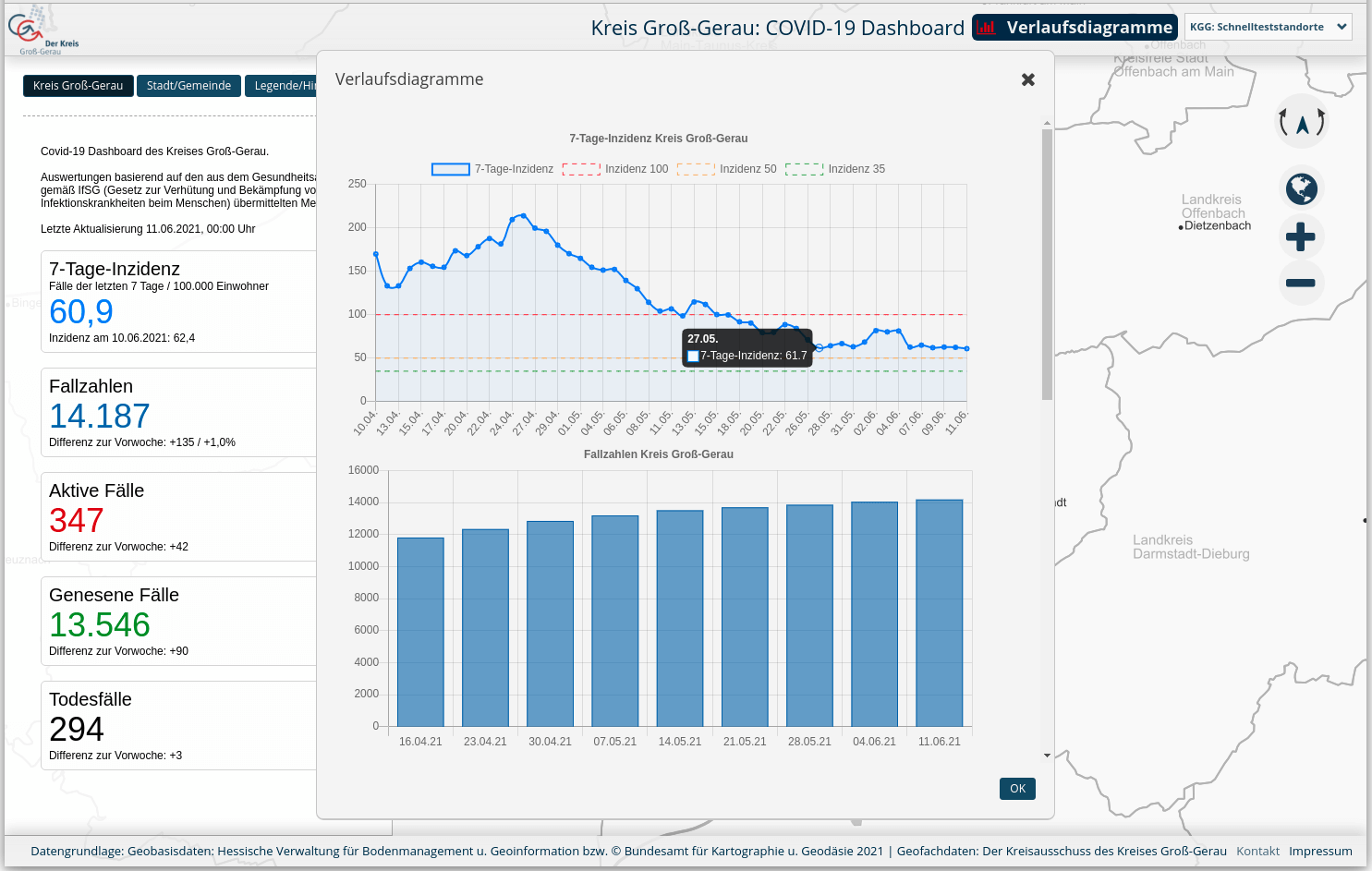 Das COVID-19 Dashboard (geoportal.kreisgg.de/application/TK_KGG_Covid_Dashboard) bietet eine Übersicht über Fallzahlen, aktive Fälle, Zahl der Genesenen und Todesfälle aus allen 14 Kommunen des Kreises und zeigt die 7-Tage-Inzidenz für das gesamte Kreisgebiet an.