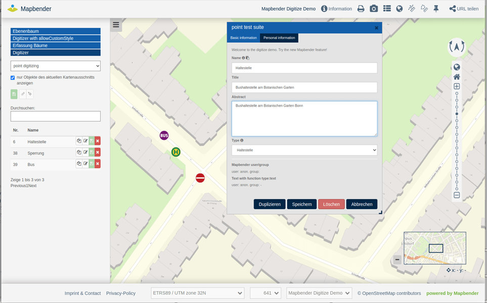 Das Digitizer-Element bietet die Möglichkeit, mit Mapbender Geodaten zu erfassen.Derzeit wird PostgreSQL als Datenquelle unterstützt, wobei als Datenquelle eine Tabelle angesprochen werden kann. Darüber hinaus ist es auch möglich, mithilfe eines Filters nur eine Auswahl von Daten aus einer vorhandenen Tabelle heranzuziehen.