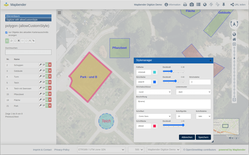Für Flächen steht in der Anwendung zudem ein StyleManager zur Verfügung, über den einzelne Objekte gestaltet werden können.