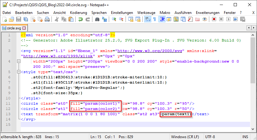 Im zweiten Schritt öffne ich die SVG-Datei mit einem Texteditor, z. B. Notepad++, und füge die dynamischen Parameter ein. Da es sich bei SVG um ein XML-Format handelt, ist dies problemlos möglich.