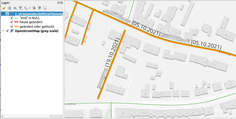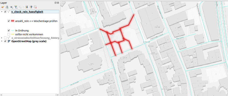 - Über einen View kann in QGIS visualisiert werden, an welchen Straßen von welchem Nutzer oder welcher Nutzerin Änderungen vorgenommen wurden (vgl. Abb. 2).