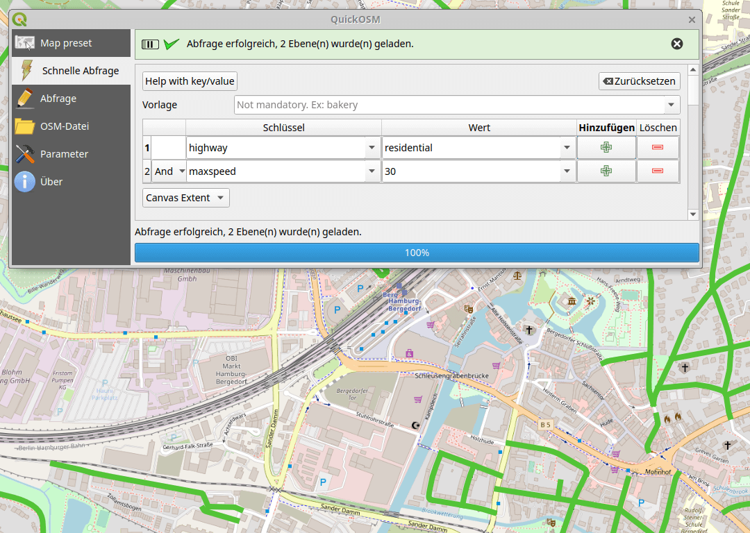 Sollte dies alles noch nicht reichen, so gibt es mit dem Plugin QuickOSM eine Art Schweizer Taschenmesser für den Download von OSM-Daten direkt in QGIS. Im Hintergrund verwendet QuickOSM die Overpass Turbo-API und stellt deren mächtigen Funktionsumfang in einer einfachen GUI bereit. Sie benötigen sämtliche kartierten Straßen mit Tempo 30 im aktuellen Kartenausschnitt? Eine Suche nach "highway=residential" und "maxspeed=30" ist mit drei Klicks angelegt und wird direkt auf den aktuellen OSM-Daten durchgeführt.