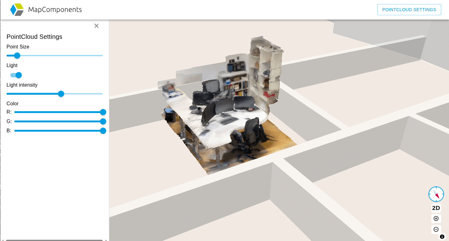 Für kleinere Datensätze können Punktwolken direkt in die Kartenanwendung integriert werden. Dies demonstrieren wir in unserer Point Cloud Demo, die als Proof of Concept entwickelt wurde. Besonders bemerkenswert ist, dass die zugrundeliegende Punktwolke mit einem handelsüblichen iPhone in wenigen Minuten aufgenommen wurde. Die Demo zeigt eindrucksvoll, wie sich Visualisierungsparameter wie z.B. Farbgebung und Punktgröße in Echtzeit anpassen lassen.