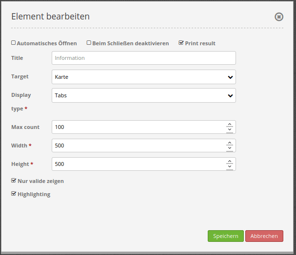 Um diese Mapbender-Funktionalität nutzen zu können, muss die HTML-Ausgabe der Infoabfrage angepasst werden. In der Ausgabe muss die Geometrie als WKT versteckt in ein HTML-div ausgegeben werden. Diese wird nicht angezeigt. Zusätzlich muss der EPSG-Code übergeben und eine eindeutige ID in dem HTML-div vorliegen.