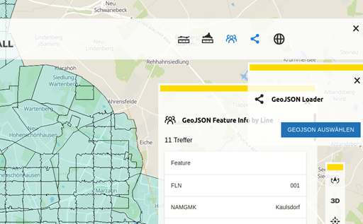 Eine Anforderung war die Erstellung eines Tools, das es erlaubt, eine Linie auf der Karte zu zeichnen und alle Geometrien („Features“) einer vorher aus einer Datei eingelesenen GeoJSON-Datenstruktur, die die Linie schneidet, ausgegeben zu bekommen. Dieses Tool setzte ich mithilfe der bestehenden MapComponents-Komponente zum Zeichnen von LineStrings auf der Karte um.