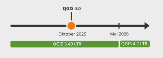 Die Veröffentlichung von QGIS 4.0 ist für Oktober 2025 angesetzt und wird keine LTR-Version sein. Das aktuelle QGIS 3.40 LTR wird bis Mai 2026 mit Updates versorgt und erst dann durch QGIS 4.2 LTR abgelöst werden. Wenn Sie sich in Ihrer Organisation immer an der aktuellen LTR-Version orientieren wollen, haben Sie also noch ein gutes Jahr Zeit, sich um den Umstieg zu kümmern.