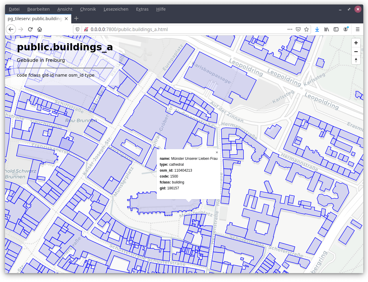 Nachdem pg_tileserv erfolgreich konfiguriert und gestartet wurde, bietet der TileServer eine Anwendung zur Datenvisualisierung.