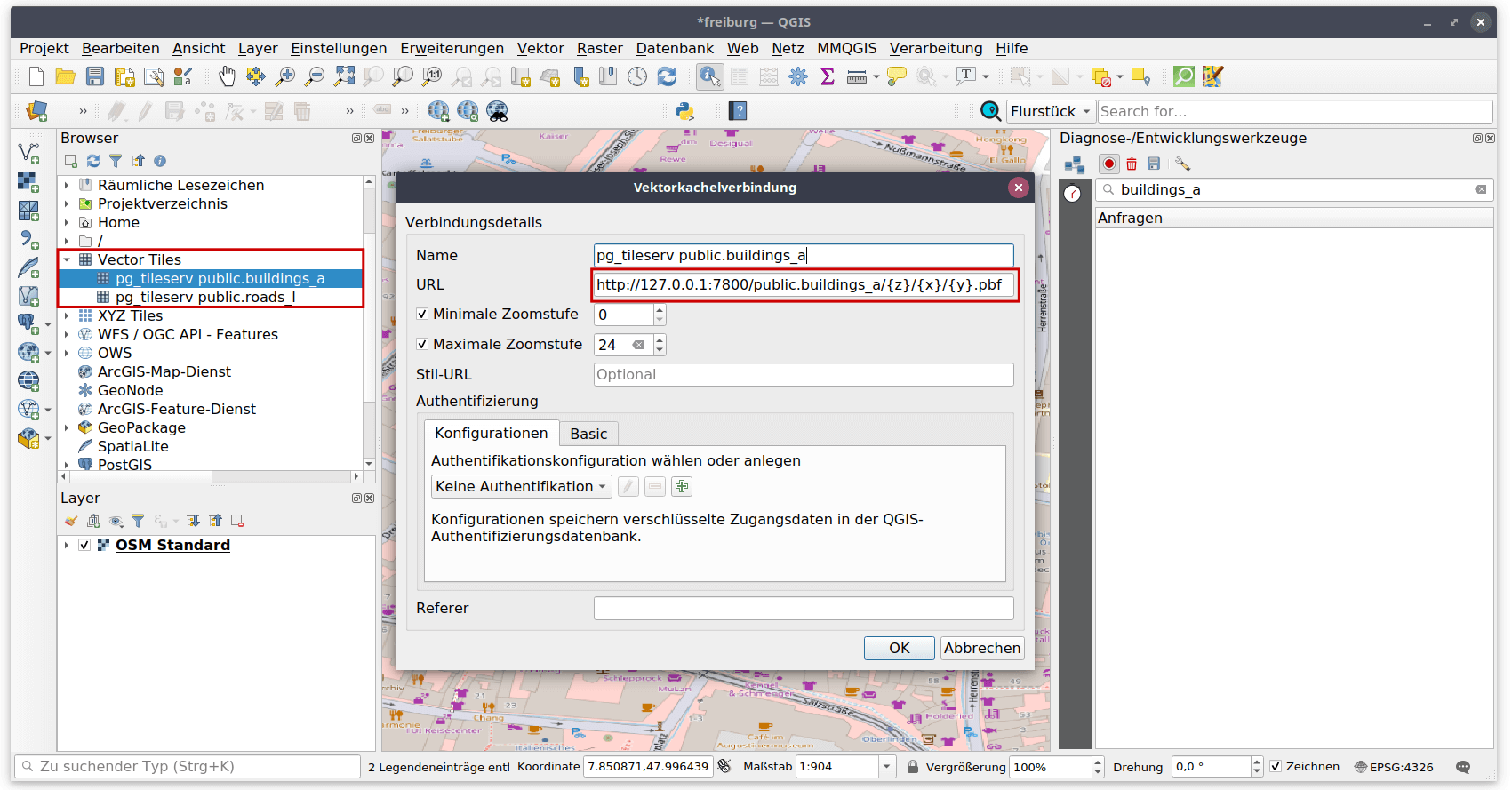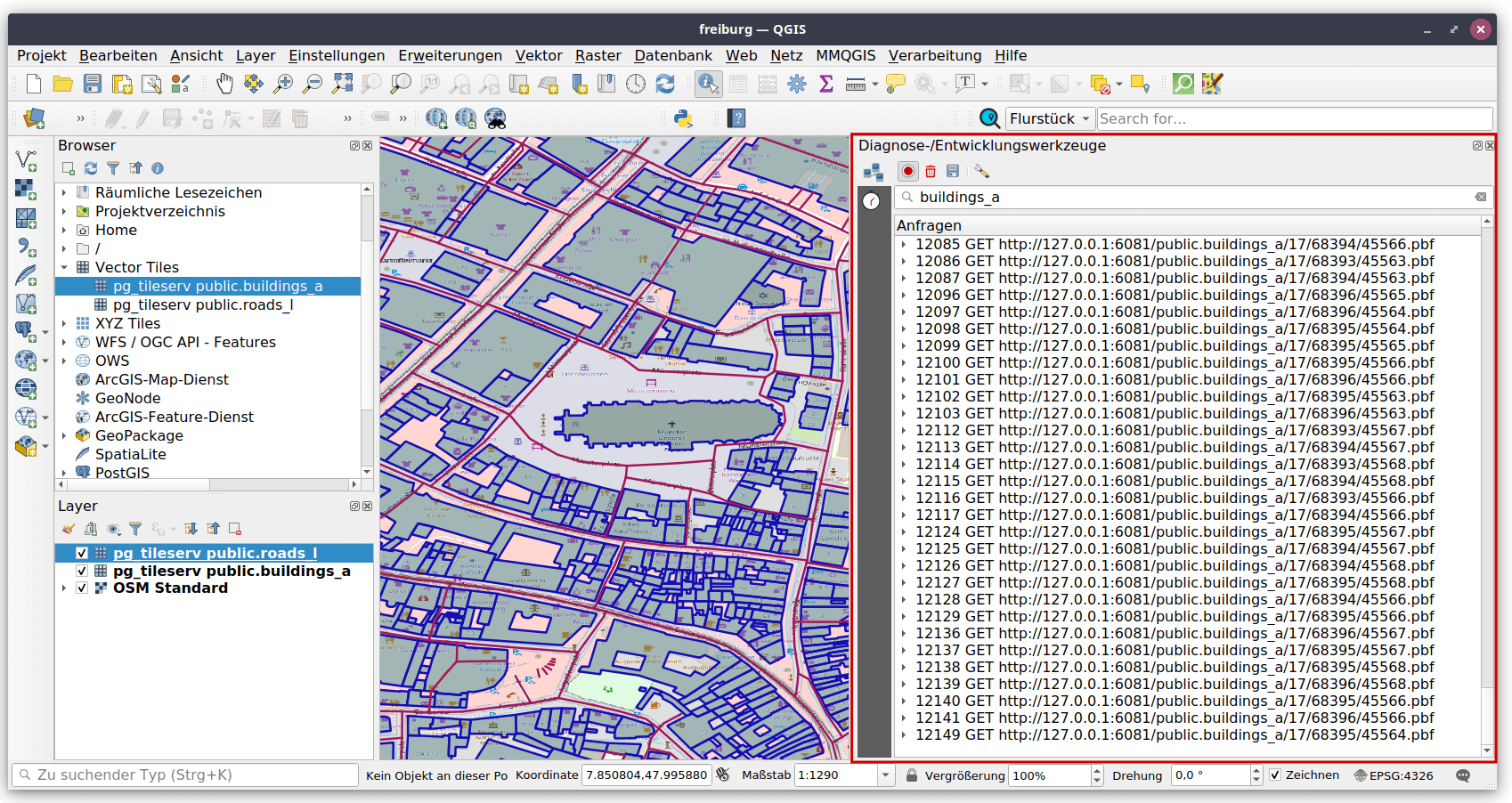 Über F12 können in QGIS die Diagnose-/Entwicklungswerkzeuge eingeblendet werden. Es kann bei der Navigation in der Karte verfolgt werden, welche Requests an den TileServer geschickt werden.