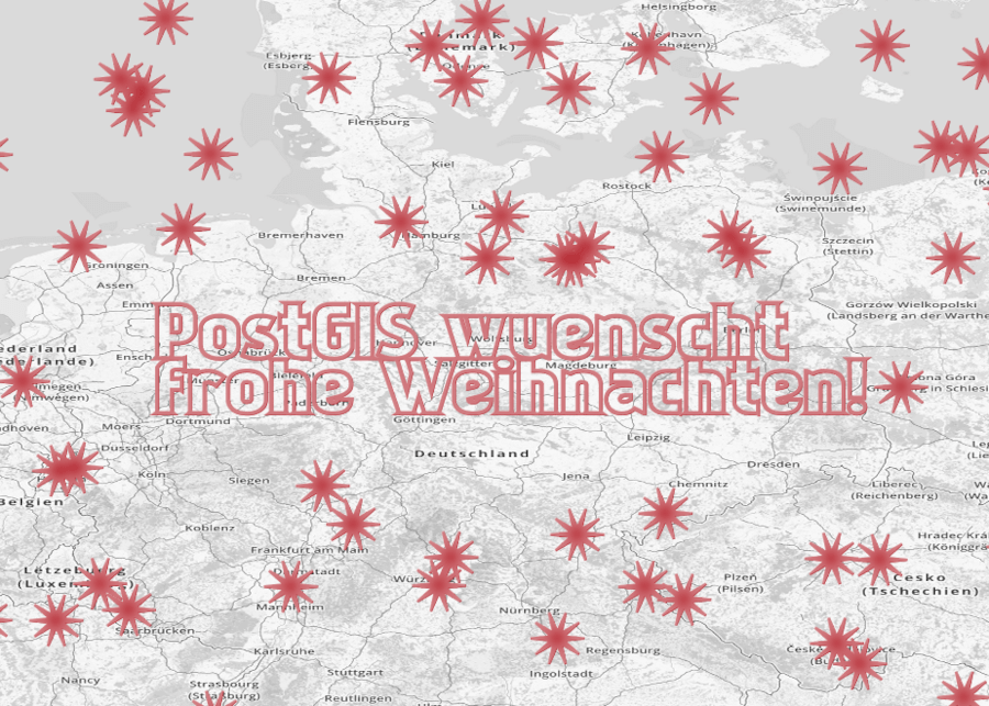 Der Weihnachtsgruß - Text und Sterne - im Titelbild dieses Beitrags werden in PostGIS on the fly generiert. Es werden keine Geodaten benötigt und für die Ausgabe müssen weder Zwischentabellen noch Funktionen in der Datenbank gespeichert werden. Ausgangspunkt waren ein paar Spielereien mit ST_Letters, das seit PostGIS 3.3 zur Verfügung steht und aus übergebenen Zahlen und Buchstaben WKB-Polygone generiert. Jacob Coblentz hat dazu einen schönen Blog-Artikel veröffentlicht [1]. Schon das Experimentieren mit der ST_Letters-Funktion macht Spaß. Die Sterne aus dem Nichts zu erstellen war allerdings die größere und interessantere Herausforderung.
