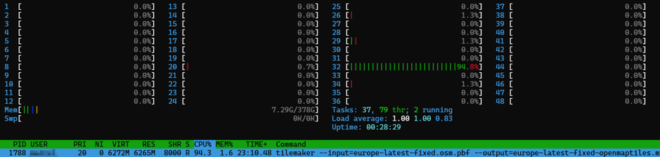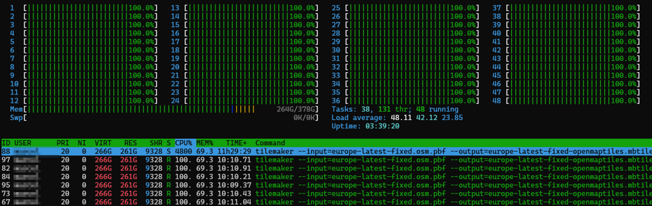 Gut, was kommt nach germany-latest.osm.pbf? Richtig, die europe-latest.osm.pbf mit knapp über 22 GB Größe - macht eine geschätzte RAM-Forderung von 268 GB RAM. Die nächst-passende VM bringt neben 378 GB RAM gleich 48 CPUs mit - letzteres kann htop ohne weitere Konfiguration schon gar nicht mehr darstellen.