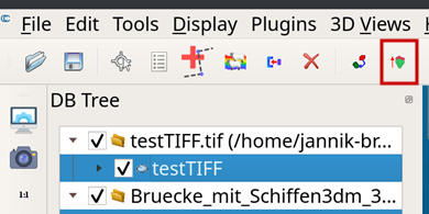 Öffnen Sie nun CloudCompare. Die PointCloud sowie die TIFF-Datei werden, wie oben beschrieben, importiert (Hinweis: Da die TIFF-Datei als eine Cloud importiert werden soll, klicken Sie hier bitte yes).