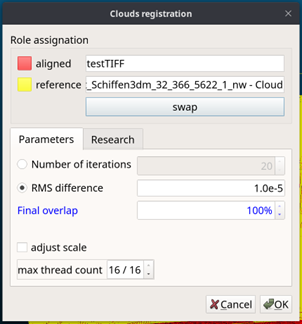 Bitte beachten Sie im folgenden Fenster, dass unter aligned die TIFF steht und die PointCloud als reference. Eine Repositionierung ist mit einem Klick auf OK möglich.