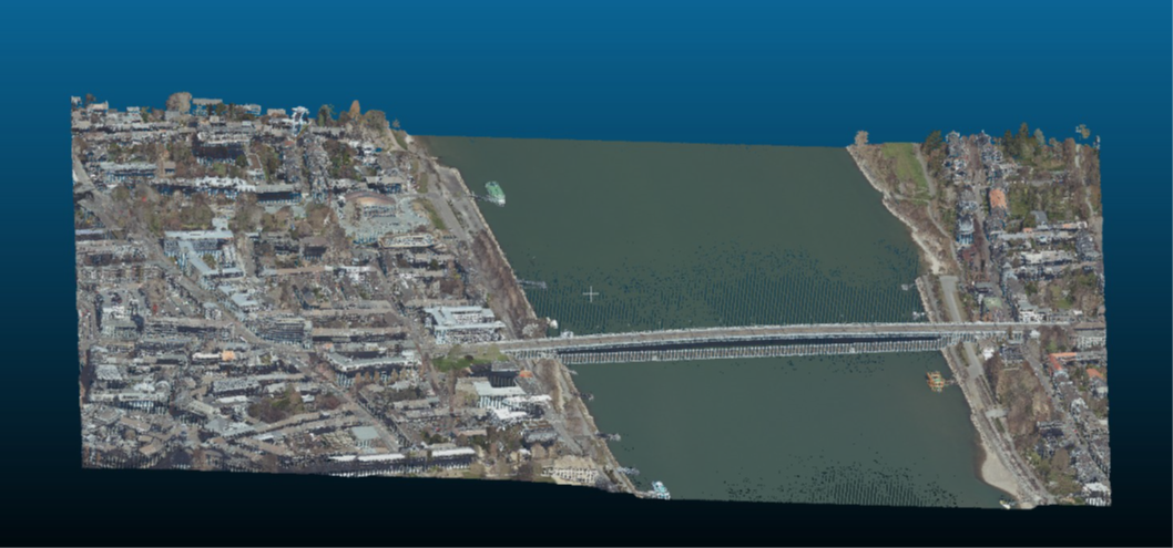 Ideales Ergebnis: Die TIFF-Datei steht in der horizontalen Mitte der PointCloud. Um Farben auf die PointCloud anzuwenden, wählen Sie beide Dateien mit strg + Linksklick und anschließend edit < colors < interpolate from another entity aus. (Hinweis: Dieser Prozess kann je nach PointCloud (im Beispiel 10.000.000 Punkte) sehr lange andauern.