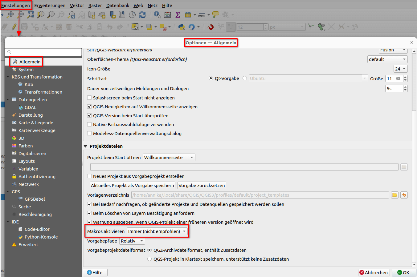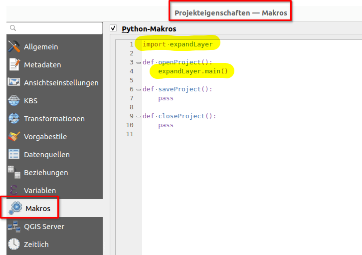 Damit ist das Skript fertig und kann in das Projekt eingebunden werden, wobei darauf zu achten ist, dass dieses im gleichen Ordner wie die QGIS-Projektdatei liegen muss. Weiterhin können in den Einstellungen Python-Makros automatisch aktiviert werden, damit dem/der Bearbeiter*in nicht jedes Mal eine Warnmeldung angezeigt wird.